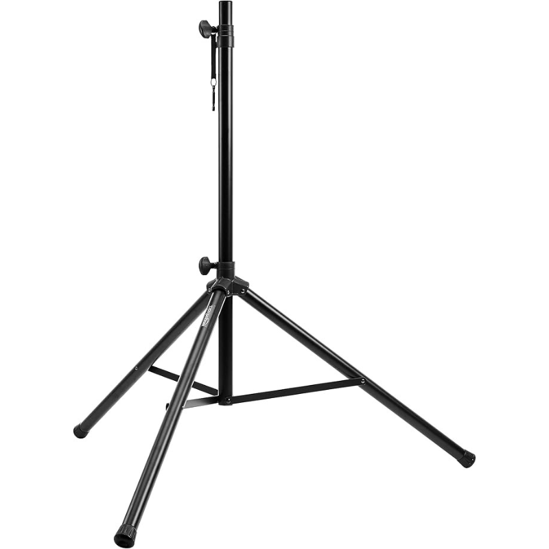 The Amazon Basics Adjustable Speaker Stand is a steel tripod stand designed to elevate and support speakers for home, studio, or live sound use. It adjusts in height from about 4.1 feet up to 6.6 feet, and uses a durable steel tube construction with a safety pin to secure the speaker. Finished in black, it offers a balance of strength, height, flexibility, and portability.
