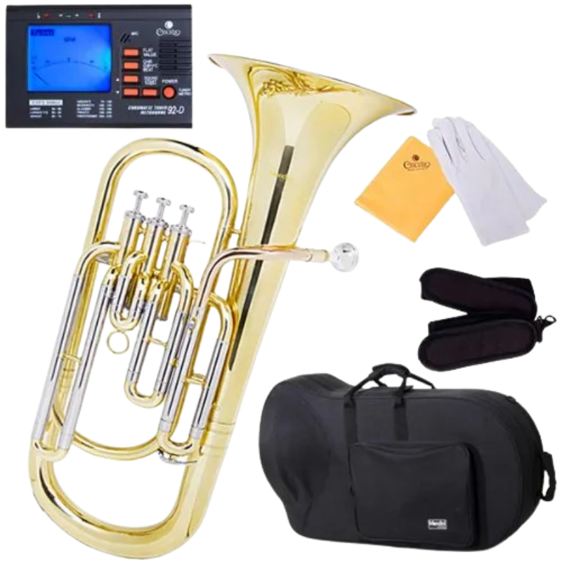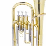 A Baritone horn with a stainless steel piston is a brass wind instrument in the key of B♭, designed for smooth, reliable valve action, especially in school, band, or marching settings. The stainless steel pistons offer durability, resistance to corrosion, and consistent mechanical performance. Such instruments typically feature a brass body (yellow or rose brass), lacquered or silver‑plated finish, upright bell, three‐valve (often with optional fourth valve) configuration, moderate bore and bell sizes to balance tone, projection, and ease of play.