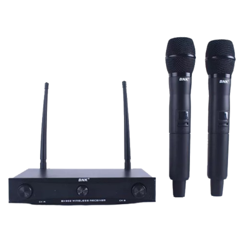 The BNK BK‑902 is a dual‑channel wireless microphone system designed for live performances, seminars, karaoke, or presentations. It includes two handheld mics and a dual‑channel UHF receiver. The system offers a reliable range, clear sound, and is built for durability and ease of use.