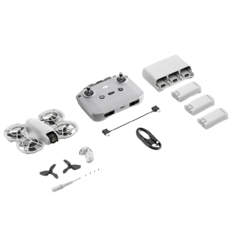 Included Components DJI Neo Aircraft x 1, DJI Neo Gimbal Protector x 1, DJI Neo Intelligent Flight Battery x 3, DJI Neo Propeller Guard (Pair) x 1, DJI Neo Spare Propeller Screw x 4, DJI Neo Spare Propellers (Pair) x 1, DJI Neo Two-Way Charging Hub x 1, DJI RC-N3 RC Cable (USB-C Connector) x 1, DJI RC-N3 Remote Controller x 1, Screwdriver, Type-C to Type-C PD Cable x 1