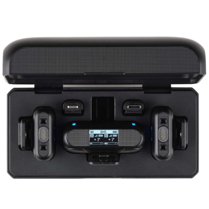 Long Battery Life + Charging Case Transmitters run ~20 h, receiver ~16 h, with the charging case providing ~1.6 full system charges (~40 h total).